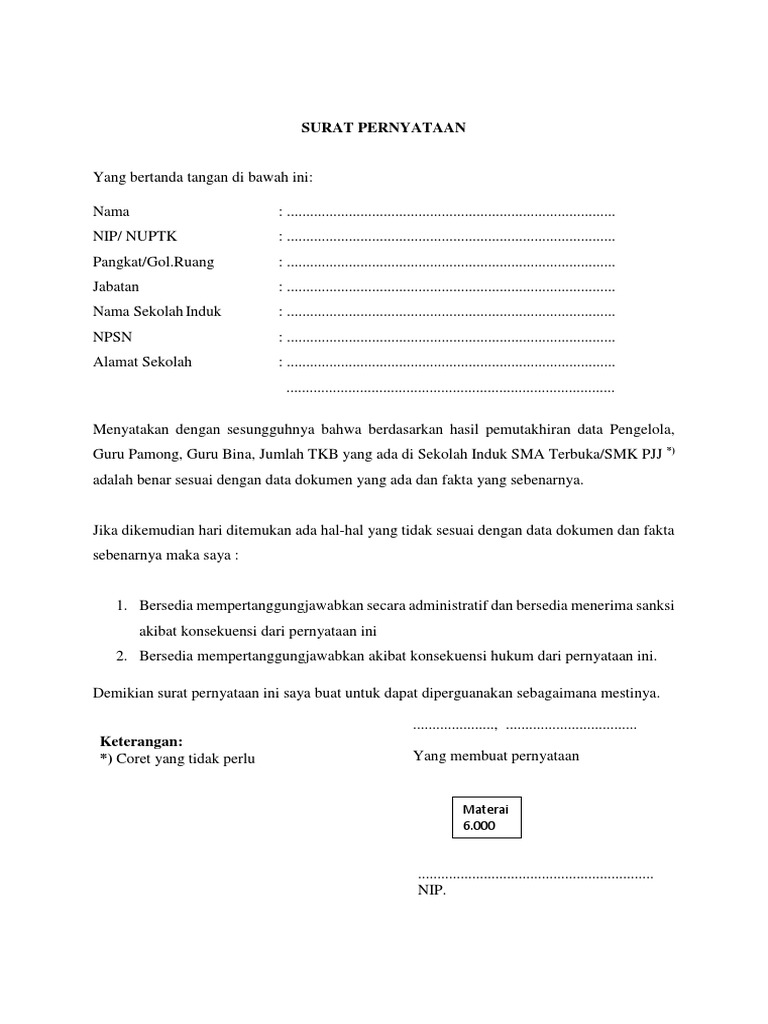 Keterangan yang menyatakan guru tersebut format surat keterangan ini bisa anda gunakan untuk anda yang mengajar di paud, sd, smp, atau sma. Yang bertanda tangan di bawah ini nama. Berikut adalah contoh surat pemberitahuan yang dikeluarkan oleh sekolah untuk para guru sehubungan dengan akan berakhirnya kegiatan belajar mengajar di sma negeri 786 jakarta tahun pelajaran 2018/2019. Berita harian guru terbaru dan terlengkap, surat pernyataan kepala sekolah untuk akreditasi 2020 di sispena. Seperti surat pernyataan kerja bermaterai selain dalam hal transaksi, surat pernyataan juga diperlukan dalam masalah pekerjaan, salah dan biasanya yang akan mengeluarkan suratnya adalah kepala sekolah yang bersangkutan. Untuk guru dan kepala sekolah yang berada di sekolah swasta berdasarkan permendikbud nomor 6 tahun 2018 tentang penugasan guru sebagai kepala sekolah itu mengacu pada permendikbud yang ditanda tangani menteri pendidikan tanggal 22 maret 2018 dan diundangkan pada tanggal 9. Misalnya saja pernyataan untuk guru, dimana pihak sekolah tidak keberatan jika guru salah satu contohnya adalah surat pernyataan kepala sekolah untuk guru sertifikasi yang berisikan pernyataan masih aktif mengajar. Dokumen ini harus diupload pada sispena sebelum mengisi data isian akreditasi setiap standar. Ada beberapa jenis surat pernyataan yang umum ditemukan di masyarakat. Anda hanya perlu mengedit data data. Biasanya, jenis surat pernyataan ini tergantung dari si pembuat ingin surat pernyataan dibuat dengan berdasarkan fakta yang berlaku di lapangan. Menteri pendidikan dan kebudayaan (mendikbud). Karena suatu surat pernyataan ini bersifat remi maka beberapa hal yang harus di lengkao dalam membuatannya, seperti kop surat.